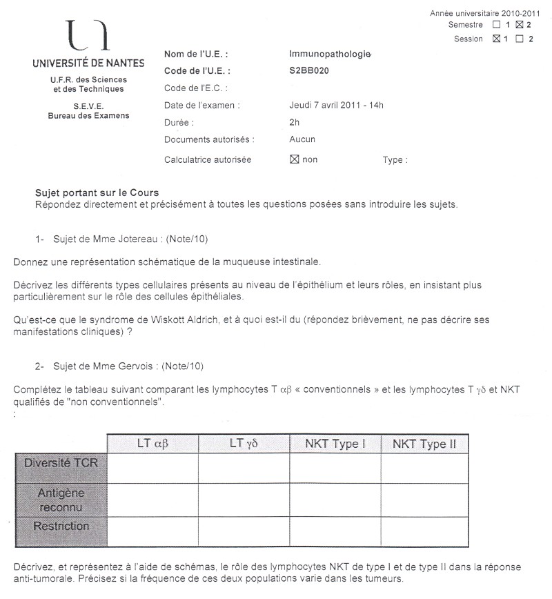 Il s’agissait ici essentiellement de vérifier les connaissances sur 2 chapitres spécifiques. D’abord sur l’organisation de la muqueuse épithéliale, et plus particulièrement le rôle des cellules de l’épithélium (avec en bonus le syndrome de Wiskott Aldrich). Ensuite, sur des populations de lymphocytes T dits « conventionnels » et « non-conventionnels » avec les détails des rôles des NKT (lymphocytes T avec des propriétés de cellules Natural Killer) de type I et II dans l’immunité anti-tumorale.